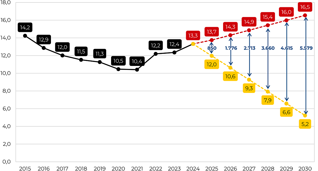 As análises permitem traçar um panorama da situação atual e apontar caminhos para avançar. O gráfico apresenta dois cenários até 2030: